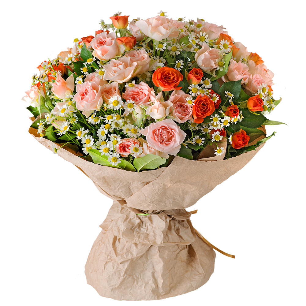 Роза кустовая микс (розовая, оранжевая), ромашки полевые, зелень. Упаковка (лента, пленка, крафт, сетка, пленка матовая)