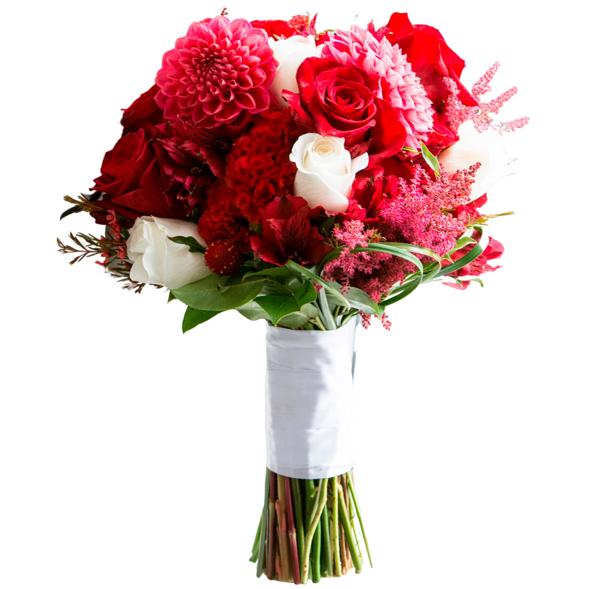 Георгина розовая, роза одноголовая красная и белая, альстромерия красная, целозия красная, астильба. Упаковка (лента, пленка, крафт, сетка, пленка матовая)