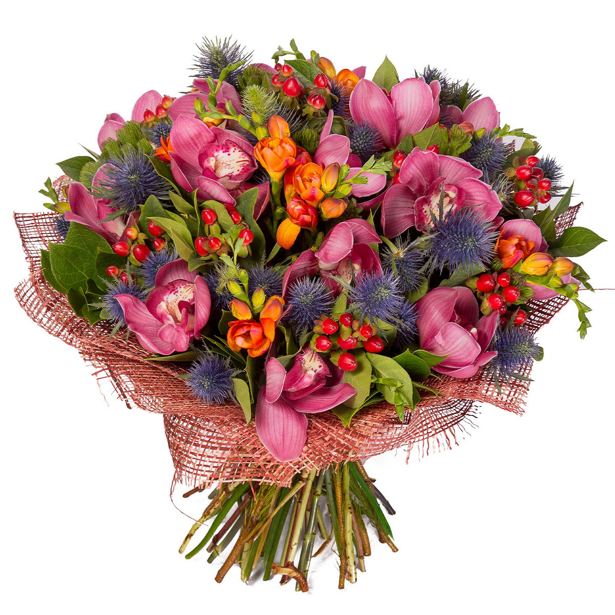 Орхидея розовая, эрингиум, фрезия оранжевая, гиперикум. Упаковка (лента, пленка, крафт, сетка, пленка матовая)