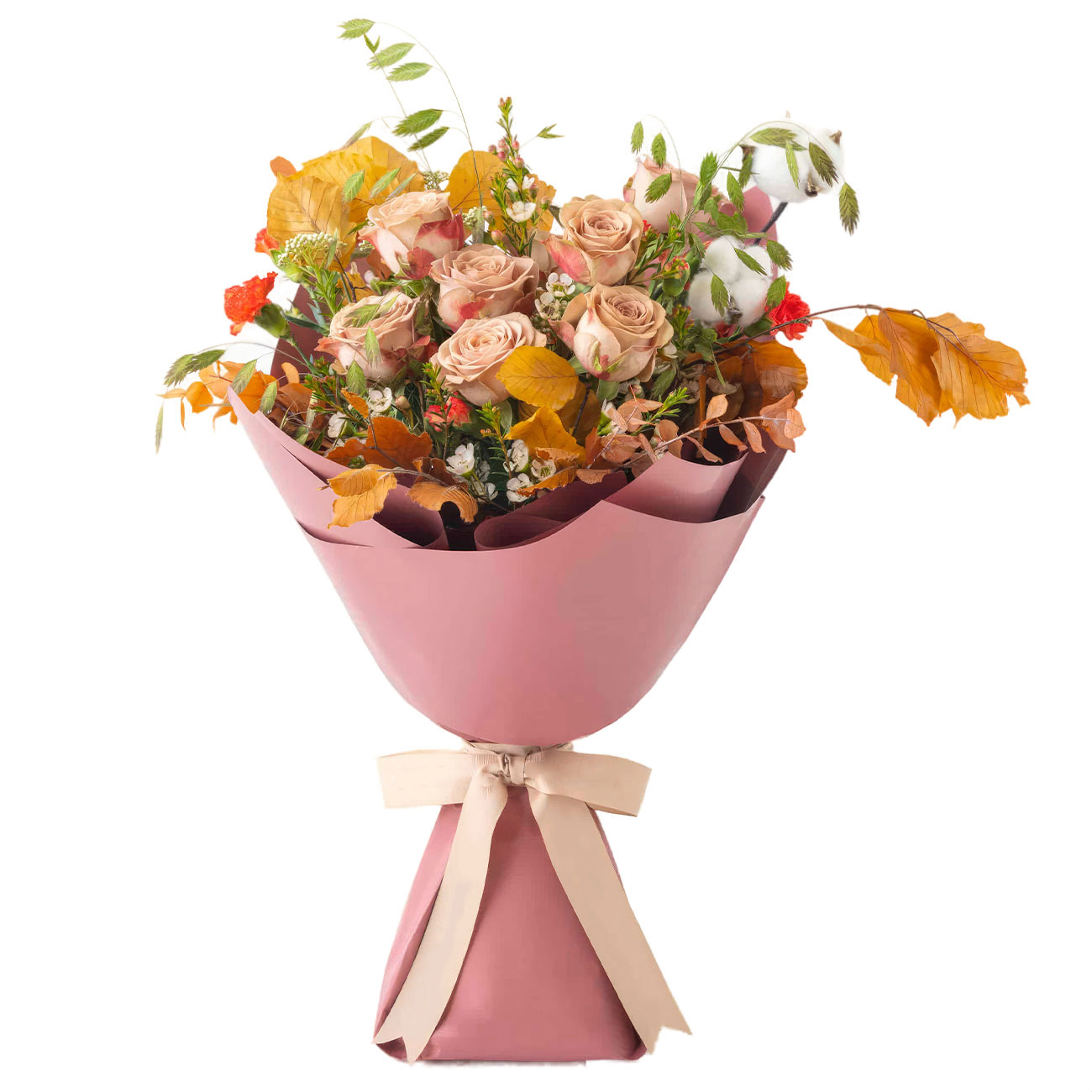 Роза винтажная кенийская персиковая, слива восковая (химонантус), гвоздика кустовая оранжевая, ваксфлауэр, рисовый цветок, хлопок, колосок прибрежной овсяницы. Упаковка (лента, пленка, крафт, сетка, пленка матовая)