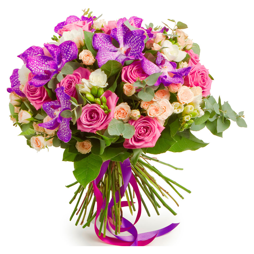 | Состав | Кустовые розы, Орхидеи, Розы, Фрезии, Эвкалипт, Эустомы |