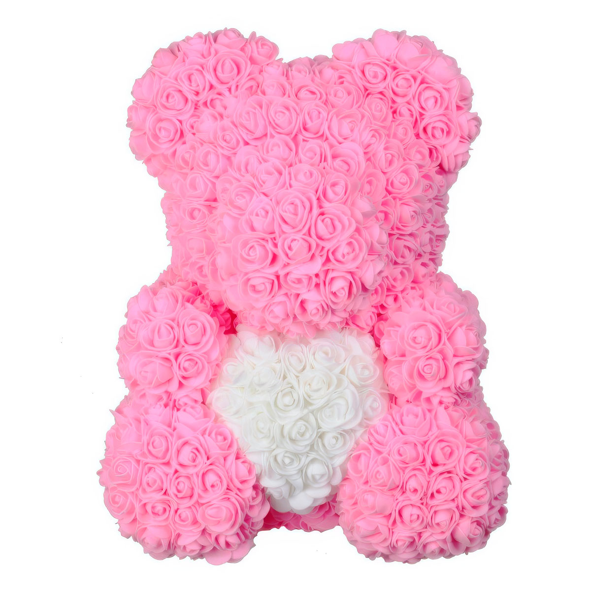 Мишка из роз розовый с белым сердцем — созданный из более чем 600 великолепных 3D розочек.