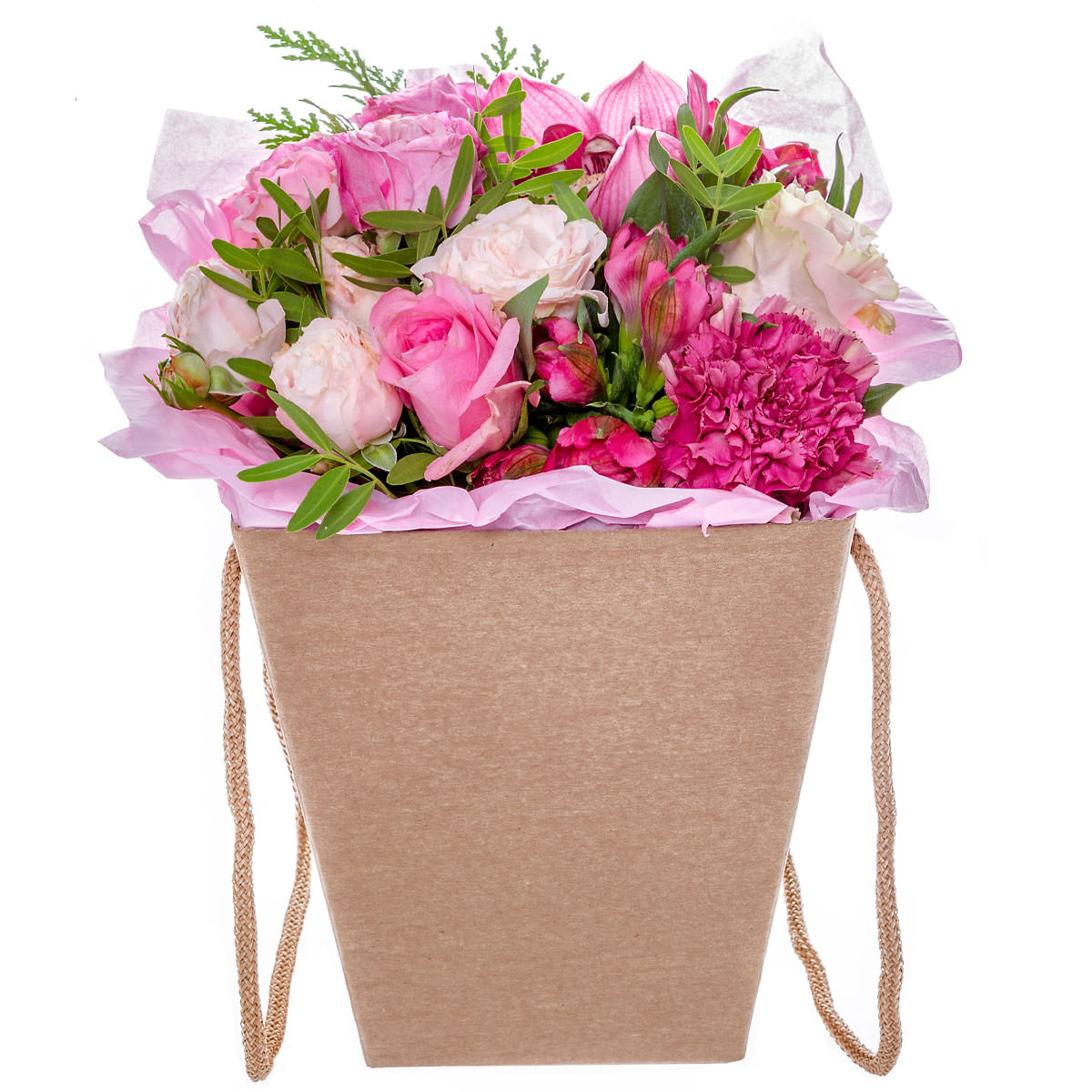 Роза одноголовая розовая, пион светло-розовый, альстромерия розовая, орхидея розовая, гвоздика розовая, туя, фисташка. Упаковка (шляпная коробка, квадратный бокс, коробка сердце, оазис)