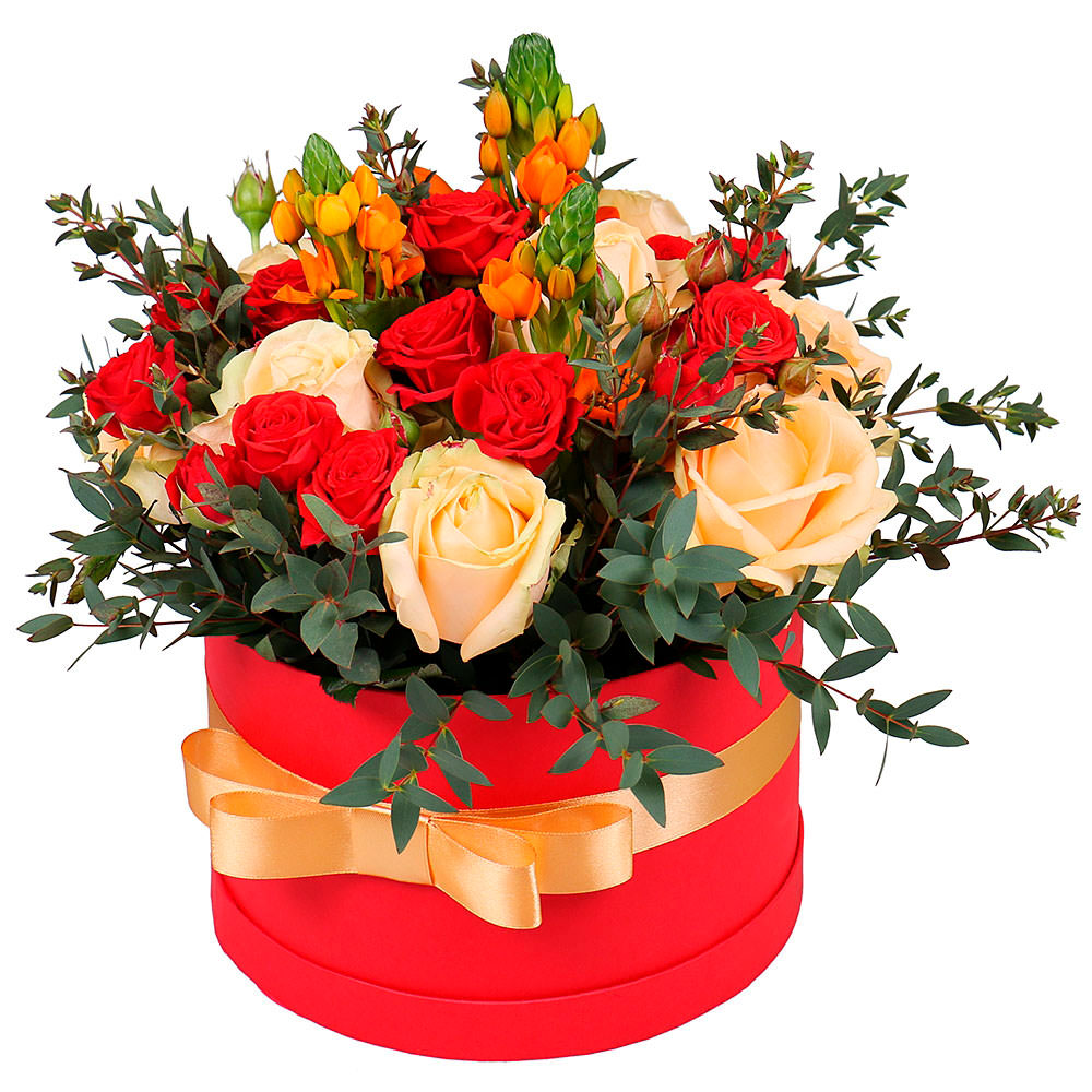 Роза одноголовая кремовая, роза кустовая красная, орнитогалум, эвкалипт. Упаковка (шляпная коробка, квадратный бокс, коробка сердце, оазис)