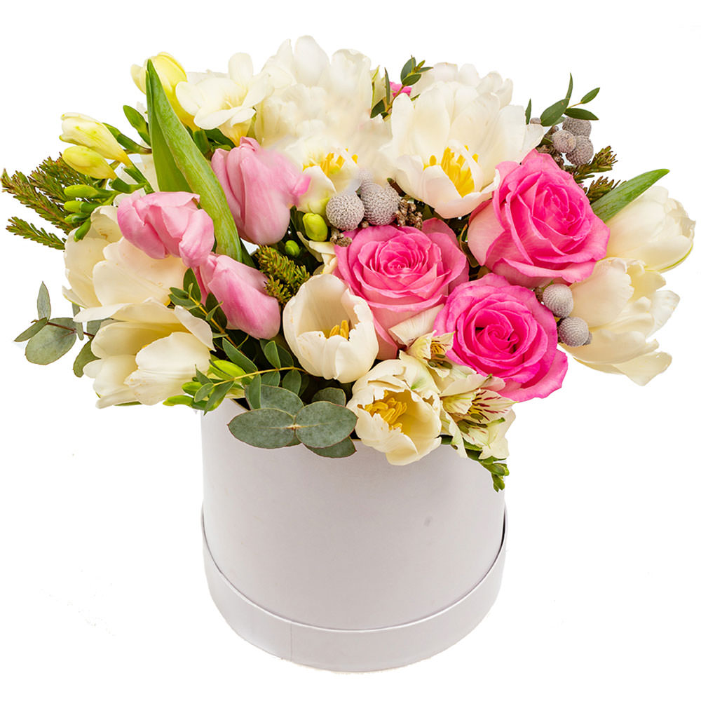 Роза одноголовая розовая, тюльпан микс (белый, розовый), альстромерия белая, бруния, фрезия белая, эвкалипт. Упаковка (шляпная коробка, квадратный бокс, коробка сердце, оазис)