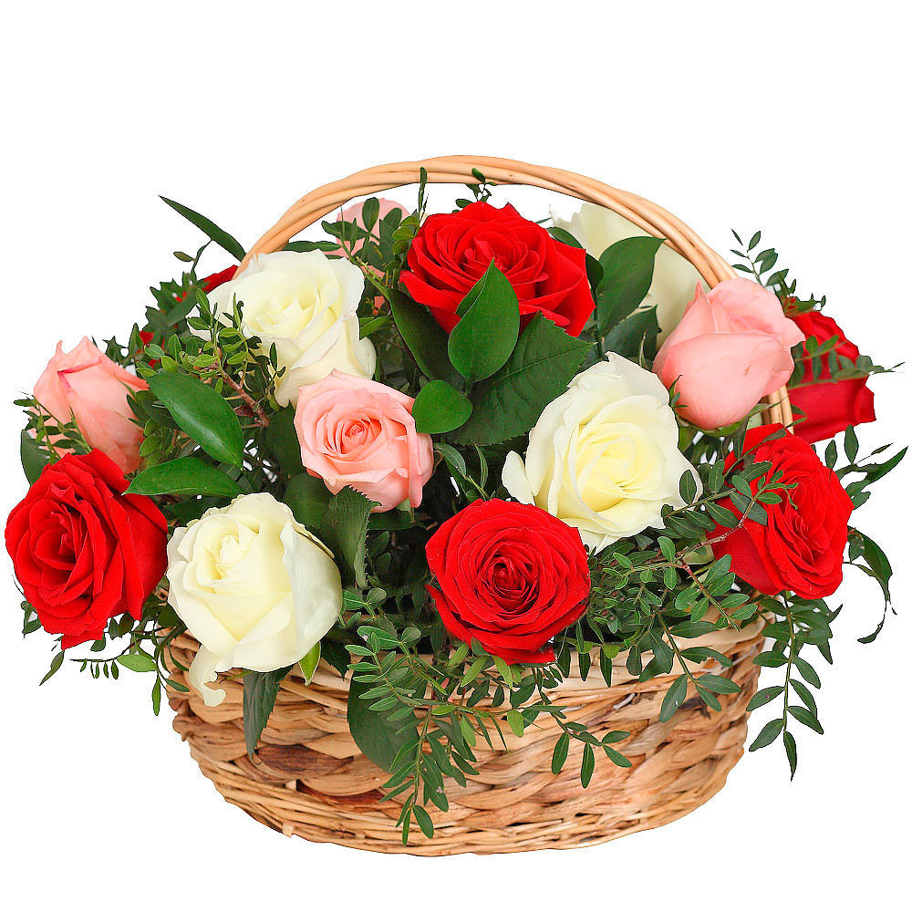 Роза одноголовая микс (белая, розовая, красная), фисташка, зелень. Упаковка (Корзина, оазис).